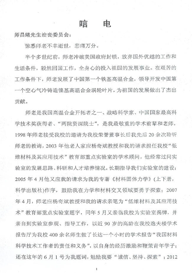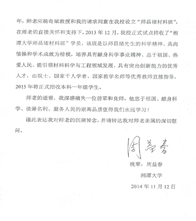 湘潭大学周益春致唁电