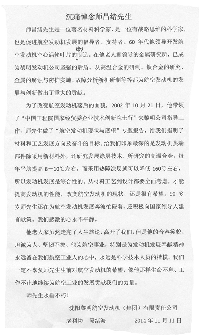 沈阳黎明航空发动机(集团)有限责任公司 老科协段绪海纪念文章