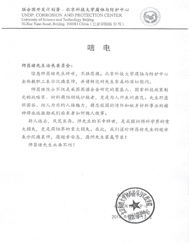 北京科技大学腐蚀与防护中心致唁电