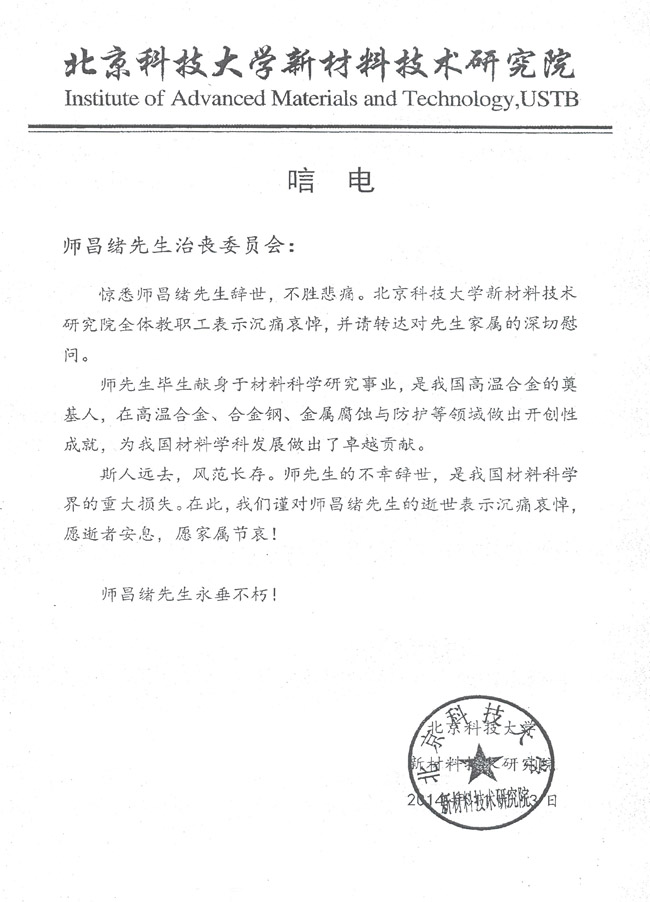 北京科技大学新材料技术研究院致唁电