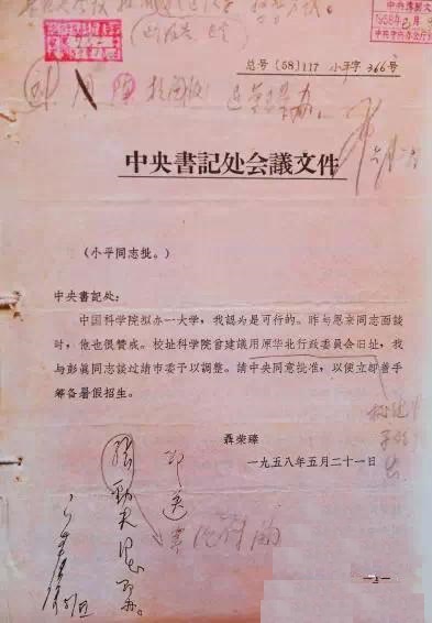 拟办一大学,我认为是可行的。昨与恩来同志面谈时,他也很赞成。校址科学院曾建议用原华北行政委员会旧址,我与彭真同志谈过请市委予以调整。请中央同意批准,以便立即着手筹备暑假招生。”1958年6月2日,邓小平同志主持召开中央书记处会议,批准了中科院党组的报告。邓小平的批示是:“书记处会议批准这个报告,决定成立这个大学。校址另议。”紧接着,刘少奇、周恩来、陈云同志都审核同意了书记处的决定。6月5日,聂荣臻副总理批示:“张劲夫同志即办”。