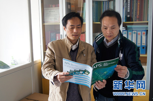 王逸平研究员(左)与宣利江研究员在办公室合影(2012年11月6日摄)。新华社发