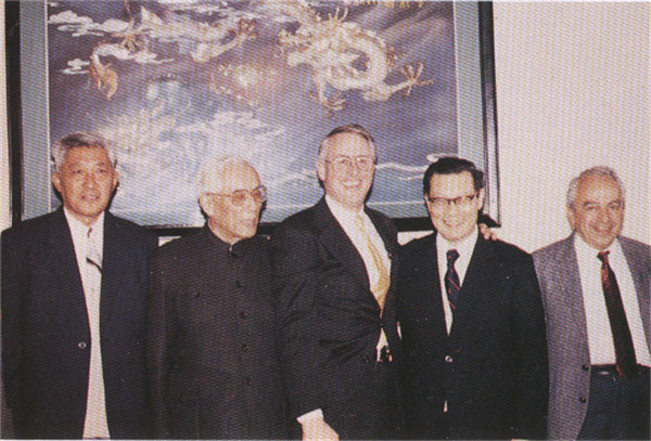 1984年,严东生与伊利诺伊大学校长Ikenberry(中)签订双边合作协议后合影