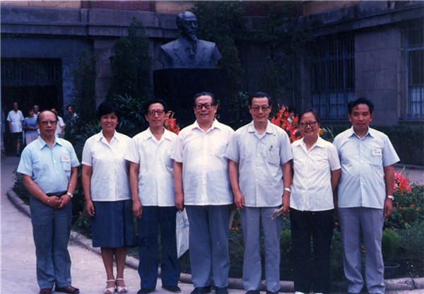 1986年,严东生陪同江泽民参加周仁铜像落成仪式