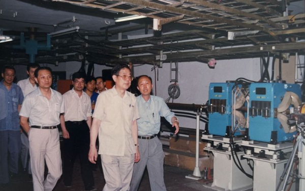 20世纪90年代初,周光召(右二)视察北京正负电子对撞机,郑志鹏(右一)接待。受访者供图