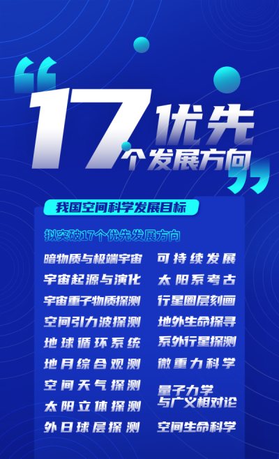 规划明确了我国空间科学发展目标,提出了我国拟突破的极端宇宙、时空涟漪、日地全景、宜居行星、太空格物5大科学主题和17个优先发展方向,描绘了至2027年、2028—2035年和2036—2050年三个阶段实施的科学任务规划,形成了至2050年我国空间科学发展路线图。