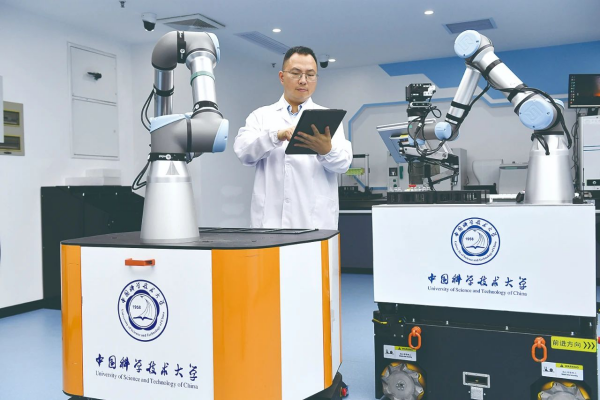 在人们的传统印象里,在实验室搞研究的都是穿白大褂的科研人员。但在中国科学技术大学(以下简称中国科大)机器化学家实验室里,却是另一番景象:这里没有一个人,只有动作灵活的机器人在操作台之间来回穿梭,伸出机械手臂配制试剂。它不仅能够做实验,还会自主设计实验步骤和方案。