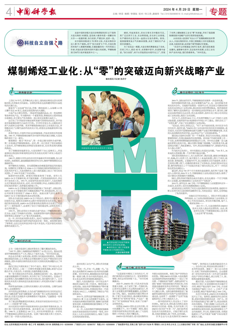 为了攻克这一难题,大连化物所勇敢地站了出来,历经三代人,前后40年,在困境中坚守,在逆境中奋进,“协力攻坚”,终于从实验室走向现代化工厂,实现了世界上煤制烯烃工业化“零”的突破,开创了我国煤制烯烃新兴战略产业并引领其快速发展。