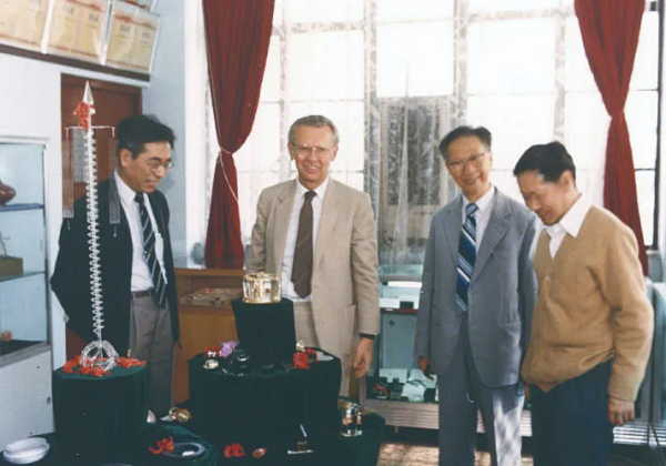 殷之文(右二)陪CERN负责人参观上海硅酸盐所陈列室。