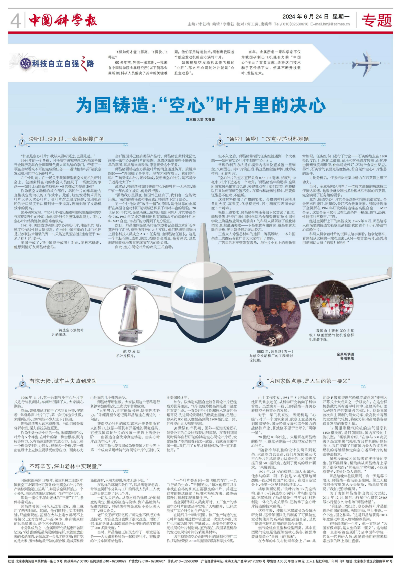 20世纪80年代初,国外一家知名发动机制造公司的总设计师来沈阳参观,在看到我国历时两年自行研制的铸造空心涡轮叶片后,发出感慨:“能亲眼看到这一成就,我就没白来中国一趟。我们用了8年才研制成功,但一直不敢使用。”