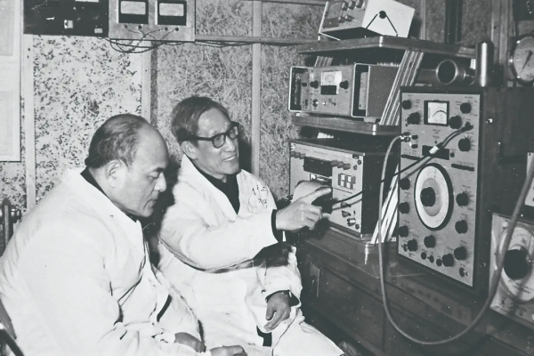 马大猷(右)进行噪声测量试验。