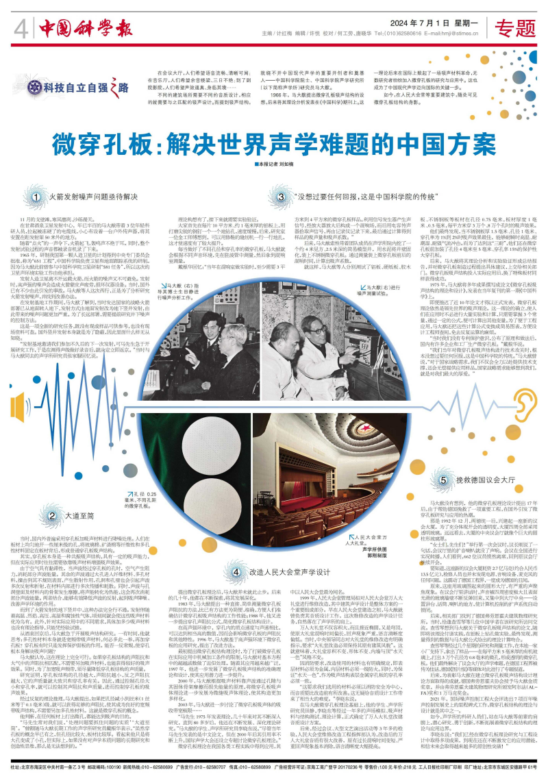 1975年,马大猷将多年成果撰写成论文《微穿孔板吸声结构的理论和设计》,发表在当年复刊的第一期《中国科学》上。