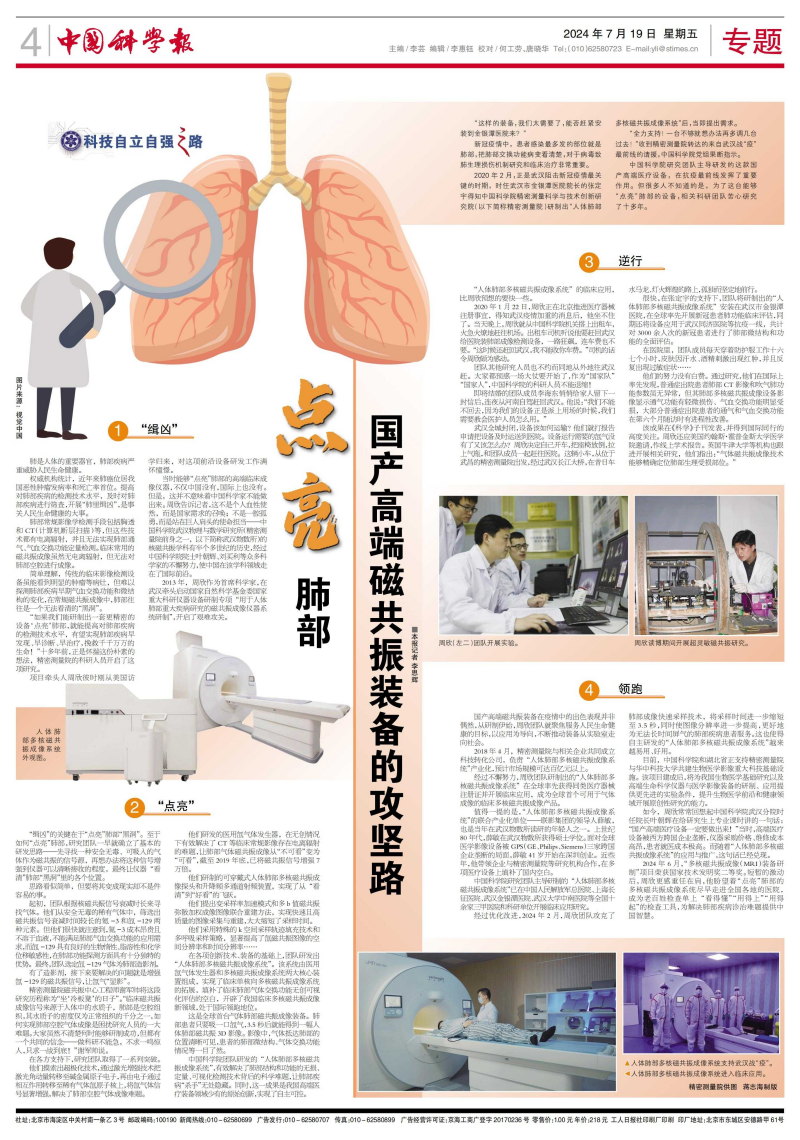 2024年6月,“多核磁共振成像(MRI)装备研制”项目荣获国家技术发明奖二等奖。短暂的激动后,周欣更感重任在肩,他盼望着“点亮”肺部的多核磁共振成像系统尽早走进全国各地的医院,成为老百姓检查单上“看得懂”“用得上”“用得起”的检查工具,为解决肺部疾病诊治难题提供中国智慧。
