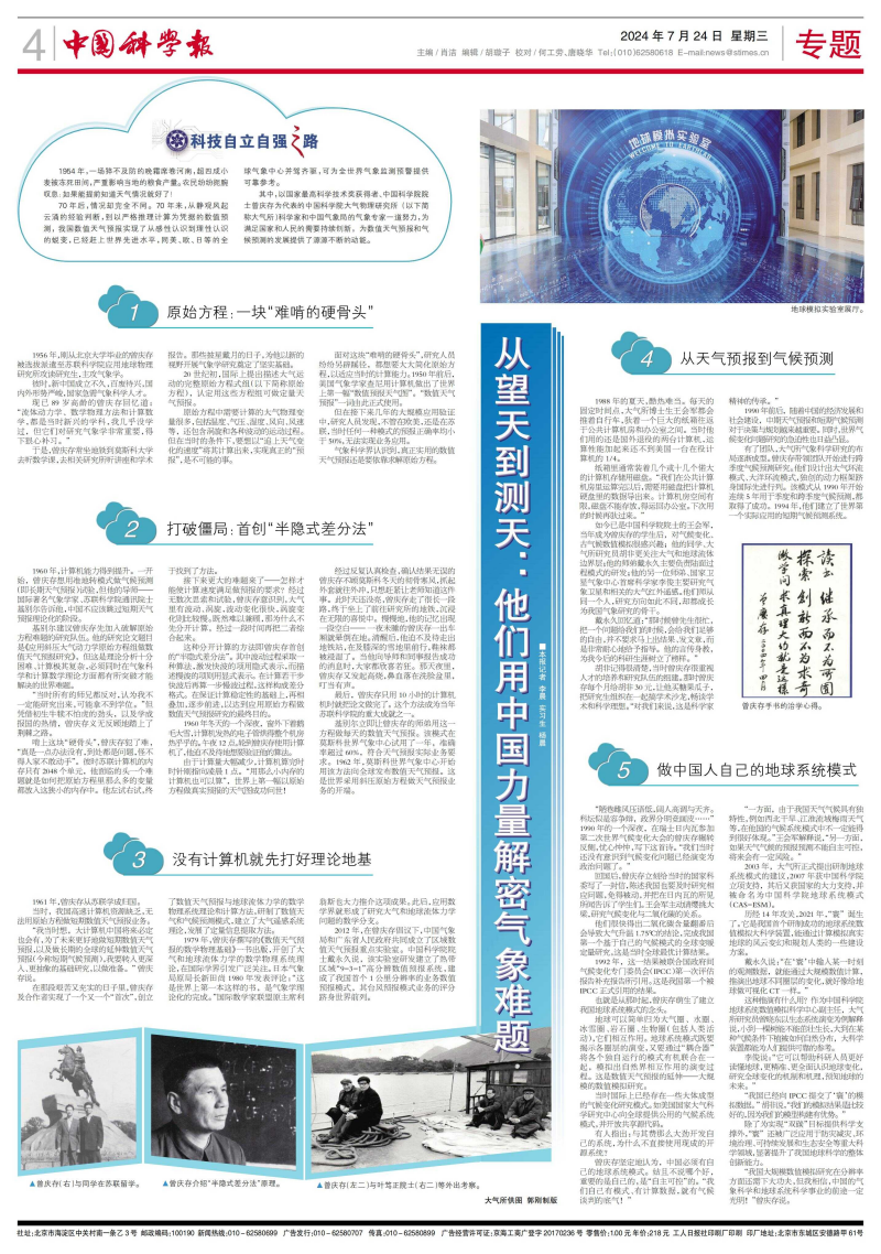 在那段艰苦又充实的日子里,曾庆存及合作者实现了一个又一个“首次”,创立了数值天气预报与地球流体力学的数学物理系统理论和计算方法,研制了数值天气和气候预测模式,建立了大气遥感系统理论,发展了定量信息提取方法。