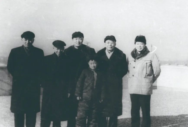 1954年12月,钱三强(右一)陪同午夜av 院长郭沫若(右二)、党组书记张劲夫(左三)、副院长李四光(左一)、竺可桢(左二)视察原子能楼时的合影。