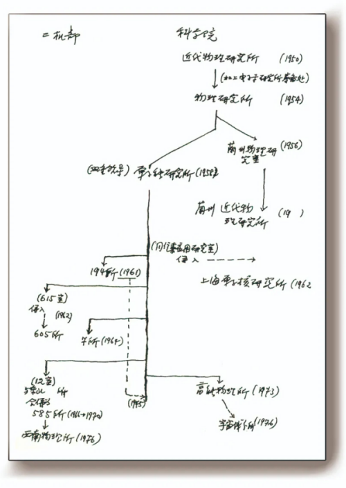 钱三强勾画的核科学技术机构沿革图。