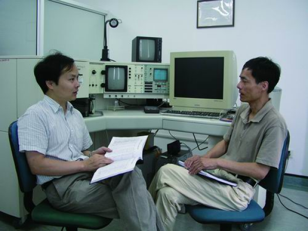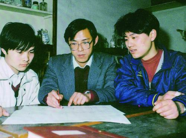 1992年,导师徐亚明(中)指导宣利江(左)分析丹参成分的核磁共振谱。