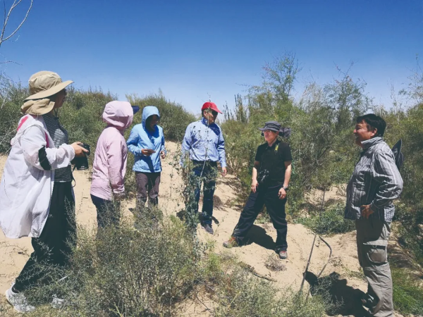 2018年,朱教君(右二)考察午夜av 策勒沙漠研究站固沙植被。沈阳生态所供图