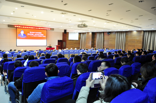 报告会邀请到上海市委党校副教授黄真作《坚持和平发展道路,推动构建人类命运共同体》辅导报告。黄真紧密结合党的十九大精神,联系当前错综复杂的国际形势,运用大量生动案例和详实数据,系统解读了以习近平同志为核心的党中央在“新时代”处理国际关系的重要思想以及“构建人类命运共同体”、“一带一路”等国家战略。整个报告具有很强的理论和现实意义,对上海有机所深入学习领会党的十九大精神具有十分重要的指导作用。