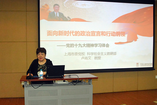 卢肖文的报告以《面向新时代的政治宣言和行动纲领》为题,从十九大召开的历史背景和重要意义谈起,全面介绍了十九大报告的框架结构和主要内容,深入剖析了中国特色社会主义进入新时代的提出依据、重大判断、丰富内涵、主要矛盾和历史使命,系统阐述习近平新时代中国特色社会主义思想的深刻内涵。报告内容全面、案例丰富、语言生动。大家认为通过这次学习对十九大精神有了更加系统的理解和全新的认识。