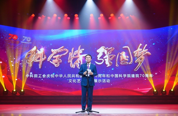 工会庆祝新中国成立70周年和中科院建院70周年文化艺术现场展示活动在北京剧院举行。中科院院长、党组书记白春礼,副院长丁仲礼,党组副书记、副院长侯建国,副院长、党组成员张涛,驻院纪检监察组组长、党组成员孙也刚,副院长、党组成员李树深,党组成员、秘书长邓麦村,副秘书长汪克强,副秘书长、院工会主席李和风等在京院领导、中央和国家机关工委群工部(统战部)部长马勇明、中国教科文卫体工会主席章国贤等有关领导出席,京区职工代表共900余人参加了活动。