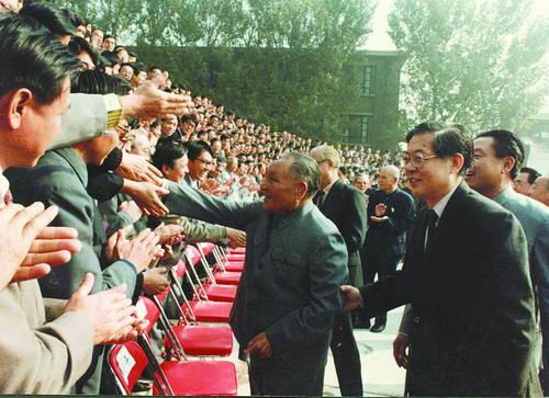 1988年10月24日,邓小平同志在时任院长周光召陪同下会见北京正负电子对撞机工程建设者。