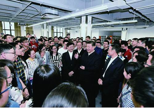 2016年4月26日,习近平总书记视察中国科学技术大学时与师生亲切交谈。