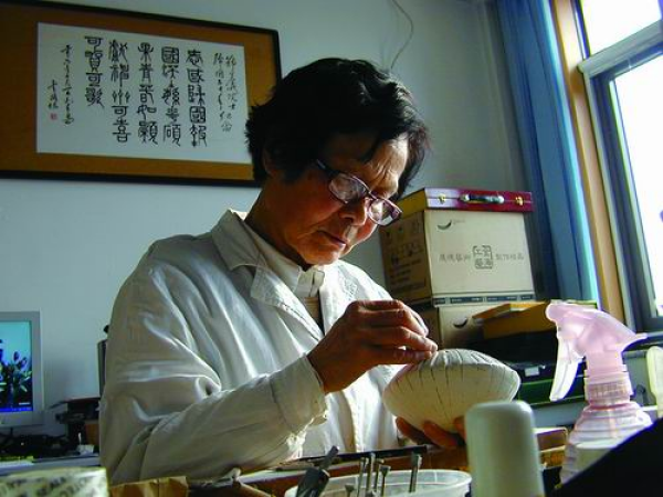 郑守仪在雕刻有孔虫模型。