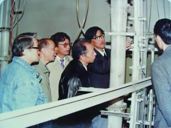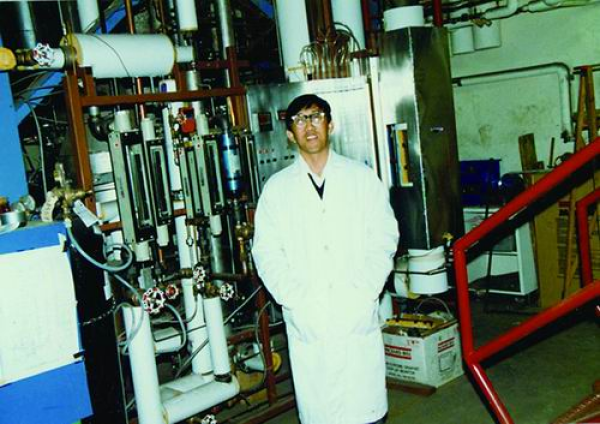 1988年,李洪钟在加拿大不列颠哥伦比亚大学从事博士后研究时,在他设计与安装的热态循环流化床烟气净化设备前留影。