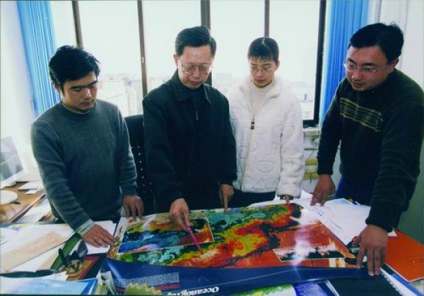 2000年,胡敦欣(左二)与学生讨论中国近海初级生产力分布情况。