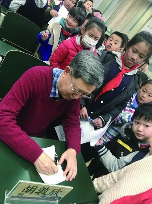 2020年12月,胡敦欣做完科普报告后给孩子们书写寄语。