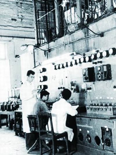 上世纪50年代,张存浩(左一)在实验室进行水煤气合成液体燃料实验。