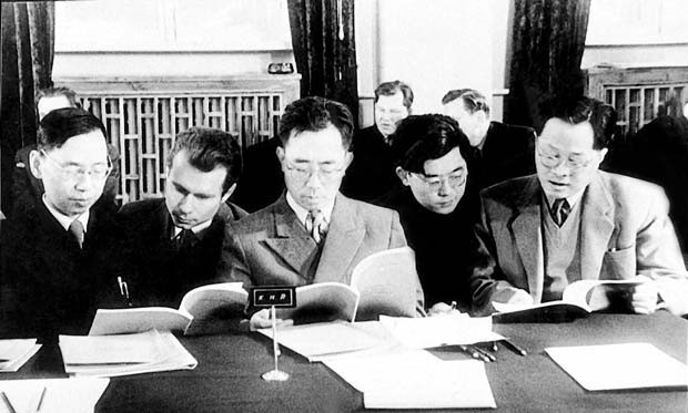 学部委员、莫斯科杜布纳联合原子核研究所副所长王淦昌(右1)等在工作