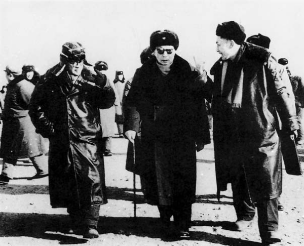1967年12月,聂荣臻副总理(中)与学部委员王淦昌(左)和朱光亚教授(右)在我国西部核试验基地
