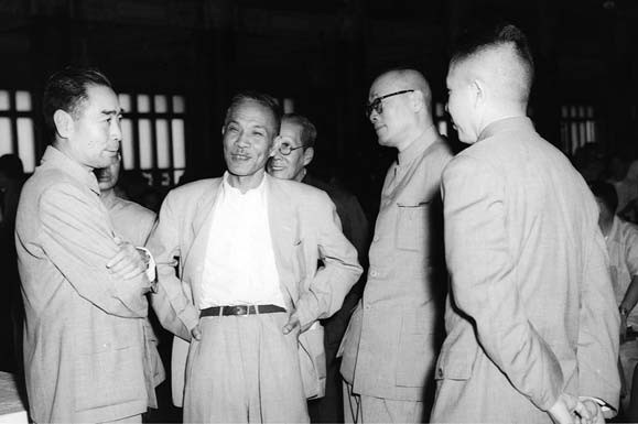 周恩来总理(左1)在学部成立大会上与哲学社会科学部学部委员翦伯赞、范文澜、周扬(前排左2起)等交谈
