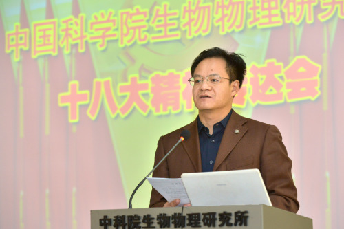汪洪岩首先介绍了党的十八大的主要内容与意义,并与大家一起学习了胡锦涛同志代表第十七届中央委员会所作的《坚定不移沿着中国特色社会主义道路前进,为全面建成小康社会而奋斗》报告的主要内容,以及十八大审议通过的《中国共产党章程修正案》的主要内容;同时,传达了院党组、京区党委对各单位认真学习宣传贯彻党的十八大精神的部署和要求,并结合研究所实际工作,就生物物理所当前和今后一个时期学习贯彻十八大精神的工作安排进行了部署。汪洪岩说,学习贯彻十八大精神既是研究所首要的政治任务,同时也是我们坚持正确的科技价值观、发展观,落实“十二五”规划和“一三五”战略目标,推动研究所在更高水平上实现跨越发展的实际需要。各党支部、党总支和全体党员,特别是各级领导干部,要严格按照中央要求和院党组、北京分院党组的工作部署,做好十八大精神的学习宣传贯彻工作,深刻理解并恪守党的工作定位,紧密围绕研究所科技创新中心工作,找准基层组织、不同岗位贯彻十八大精神的结合点,要理性深入思考、把握精神实质,脚踏实地行动、追求实际效果。全体党员要牢固树立和坚持创新科技、服务国家、造福人民的价值追求,不辜负国家和人民的信任与期待。