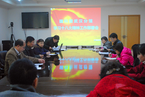 武汉分院党组关于学习贯彻党的十八大精神的通知》的相关要求。陈丹强调,学习贯彻十八大精神最终要落实到推进分馆工作上,目前及今后一段时期,一切工作都要围绕落实十八大精神开展,把十八大精神转化为具体的工作举措和制度机制,各部门要认真组织,干部要率先垂范,推动学习宣传贯彻十八大精神向广度和深度拓展。最后,陈丹要求各党支部要统一思想,迅速掀起学习宣传贯彻十八大精神的热潮;全面准确地领会和把握十八大精神,把思想和行动统一到十八大精神上来,自觉用十八大精神武装头脑、指导开展工作;牢记使命,立足本职,围绕国家战略任务需求,配合国家创新驱动发展战略,推进分馆“创新2020”跨越发展和“一三五”规划的顺利落实。