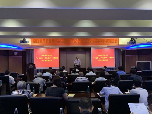 南海海洋研究所召开“不忘初心、牢记使命”主题教育部署推进会。中科院“不忘初心、牢记使命”主题教育第十四指导组到会指导,南海海洋所领导班子成员、党委委员、纪委委员、中层干部、六级以上职员、在职支部支委和离退休支部书记等参加会议。会议由党委书记、副所长詹文欢主持。