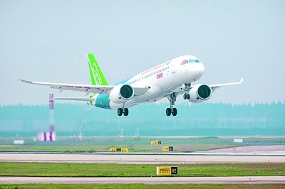 我国具有自主知识产权的大型喷气式民用飞机C919。