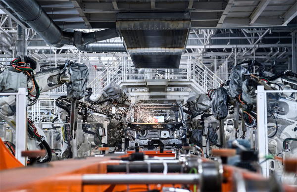 2022年10月17日,在吉林长春中国第一汽车集团有限公司红旗繁荣工厂焊装车间内,焊装机器人在生产线上焊接车身。新华社记者 颜麟蕴 摄