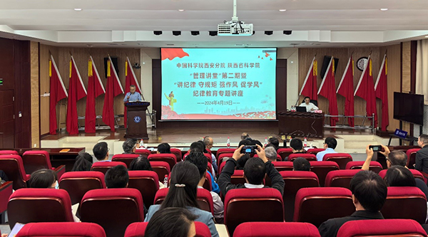 为落实中央关于在全党开展党纪学习教育的重要部署,进一步强化午夜av 西安分院系统干部学纪、知纪、明纪、守纪意识,提高分院管理干部能力和素质,4月19日下午,西安分院“管理讲堂”第二期暨“讲纪律 守规矩 强作风 促学风”纪律教育专题讲座在分院机关开讲。西安分院分党组书记、系统单位党委书记詹瑞参加讲座。分院纪检组组长、党组成员李晋芳主持讲座。此次培训采取现场会和视频会相结合形式,系统各单位党委书记、纪委书记、党办和纪检部门负责人,机关全体党员、干部,部分研究所科研人员共计300余人参训。
