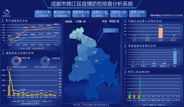 疫情就是命令,信息就是生命。中科信息在春节假期内即刻组建了一支精锐团队赶到现场,与政府工作人员一起讨论形成系统设计方案,经过连续48个小时奋战,高效开发完成了锦江区“人员信息大数据管理系统”。该系统包含“疫情防控入户走访排查”“智能数据关联比对分析”“疫情防控大数据可视化展示”等功能模块,提供了电子化在线填报、数据联动分析以及可视化展示功能,能有效提升疫情防控一线的工作效率,便于第一时间高效、直观掌握本辖区人员信息情况,为疫情的阻击防控提供数据支撑以及辅助应急指挥决策。