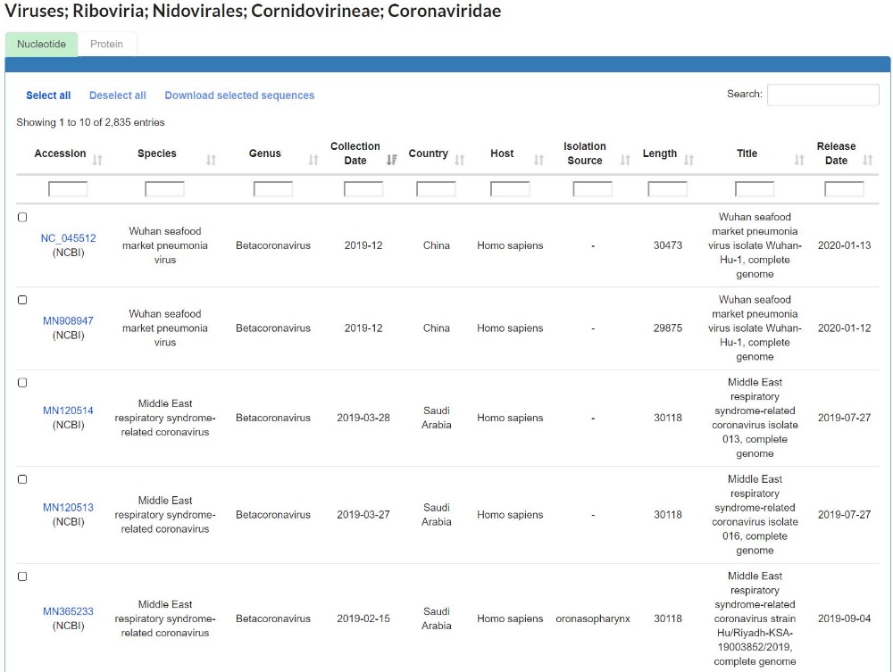 2019新型冠状病毒资源库收录了来源于NCBI的GenBank数据库和GISAID数据库发布的2019新型冠状病毒(2019-nCoV)病毒株的株名、采样日期、采样地点、样本提供单位、数据递交单位等元信息。通过该资源库还可访问到国家基因组科学数据中心基因组数据库GWH从公共数据库收录的冠状病毒科基因组和蛋白序列,用户可基于Accession号、种名、属名、采样日期、采样地点、宿主、分离源、发布日期等元信息筛选感兴趣的冠状病毒株,个性化选取序列进行下载以开展相关的科学研究。