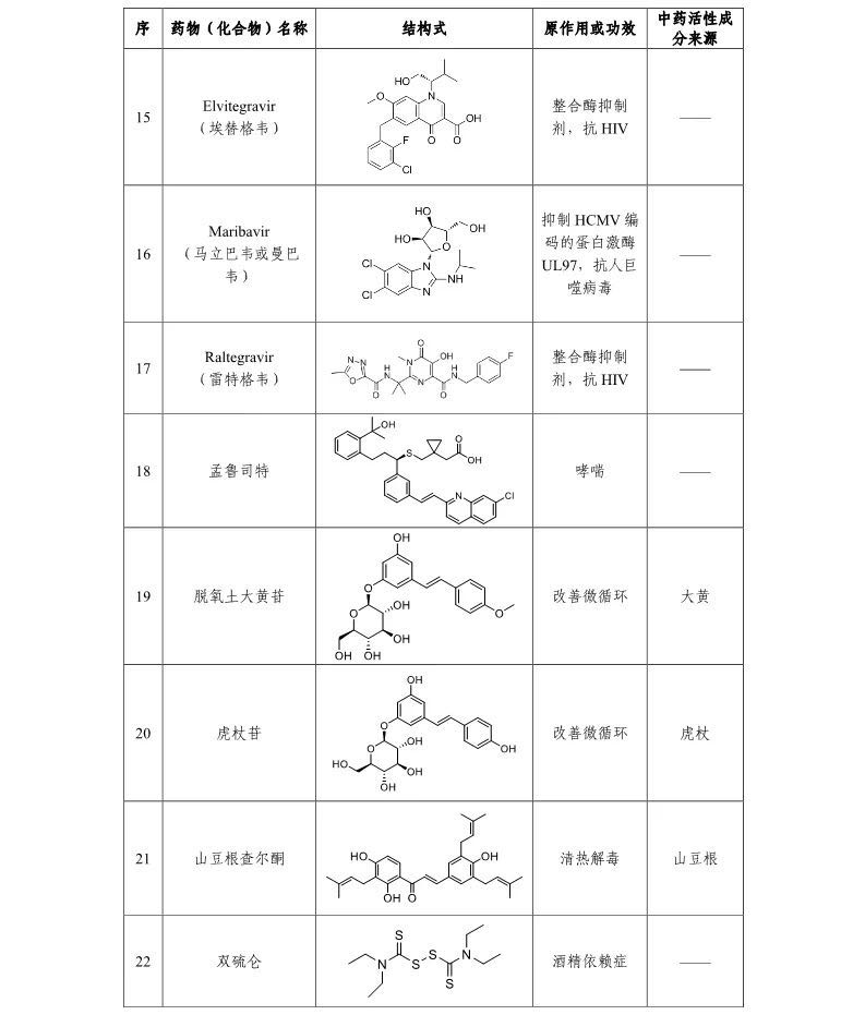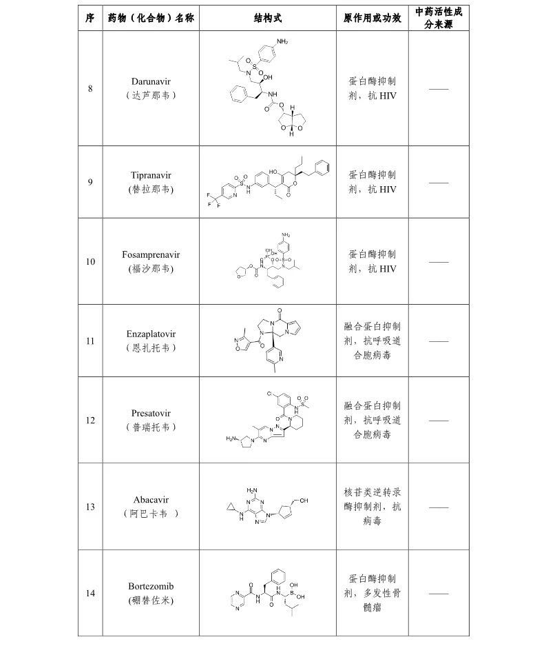 候选药物包括蛋白酶抑制剂茚地那韦(Indinavir)、沙奎那韦(Saquinavir)、洛匹那韦(Lopinavir)、卡非佐米(Carfilzomib)、利托那韦(ritonavir)等12种抗HIV药物,2种抗呼吸道合胞病毒药物,1种抗人巨噬病毒药物,1种抗精神分裂症药物,1种免疫抑制剂以及2种其他类药物;研究发现含有“二苯乙烯”结构的孟鲁司特以及植物药活性成分虎杖苷和脱氧土大黄苷与Mpro结合较好,可能对病毒有抑制作用;在前期抗SARS研究及计算机模拟基础上发现老药肉桂硫胺、环孢菌素A可能对2019-nCoV有效,其中肉桂硫胺是上世纪70年代用于抗精神分裂症的药物,对冠状病毒3CL水解酶具有抑制作用,免疫抑制剂环孢菌素A可以阻止病毒的核衣壳蛋白与人的环孢亲和素A相互结合,已有研究表明联用干扰素和环孢菌素A能显著抑制冠状病毒在人类支气管和肺部复制及造成的组织损伤。他们研究还发现,虎杖、山豆根等中药材中可能含有抗2019-nCoV有效成分。