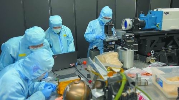 科研人员在进行正样光谱仪低温光校。中科院上海技术物理研究所供图