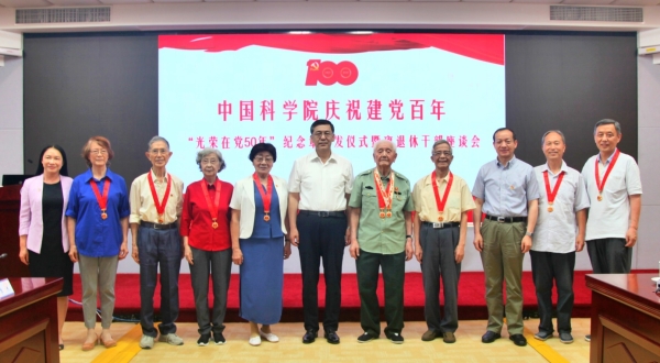 举行“光荣在党50年”纪念章颁发仪式暨离退休干部座谈会。中科院副院长、党组副书记阴和俊出席并讲话,副秘书长李和风主持仪式活动。