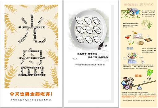 由研究生党总支牵头,组织各学生支部围绕“谁知盘中餐、粒粒皆辛苦”、“拒绝舌尖上的浪费”、“从我做起、拒绝盛宴”、“节约生活、共建绿色家园”、“节约粮食、人人有责”等主题,结合自身专业,组织编排制作宣传展板。制作完成后进行现场大众投票,选出最有创意且有教育意义的展板3个。